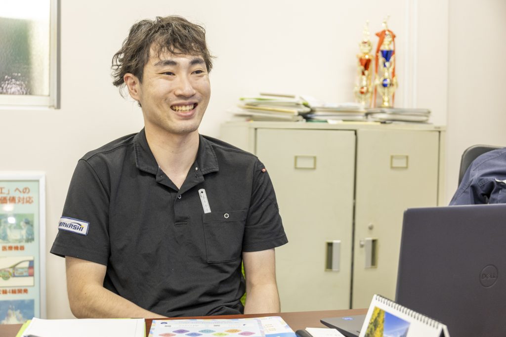 同社では、そうした人材を育成する「自立した組織への改善」を目標に掲げ、教育カリキュラムや勉強会・研修といった自発的な学びを促進するリスキリング環境を整備しています。中でも、リスキリング成果のロールモデル的な存在として活躍しているのが、技術部の伊藤新さん。5年前に機械加工未経験で入社した伊藤さんですが、今ではものづくりの現場から、営業、さらには採用や業務改善といったチームマネジメントの領域までを担う「ロジカル人材」として活躍しています。伊藤さんについて「スーパー技術者にはなれないかもしれないけれど、マルチに適性がある」と評価する今橋社長。伊藤さんも、自分の望むキャリアパスに沿った支援を得られ、賃金含め期待する処遇を得られていると笑顔を浮かべます。