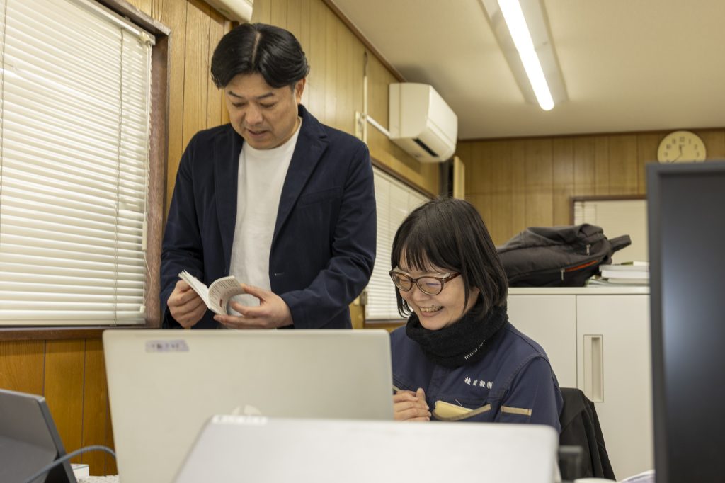 「3年前に新設したポジションです。現場代理人と連携し、現場作業を進める際に必要な書類作成など支援業務を担います。それまでは現場担当者自身が現場作業後に会社へ戻ってきてから書類を作成していたので、どうしても残業時間が多くなりがちでした。建設ディレクターを置いたおかげで、残業時間の削減にも繋がりました」と石井社長。
